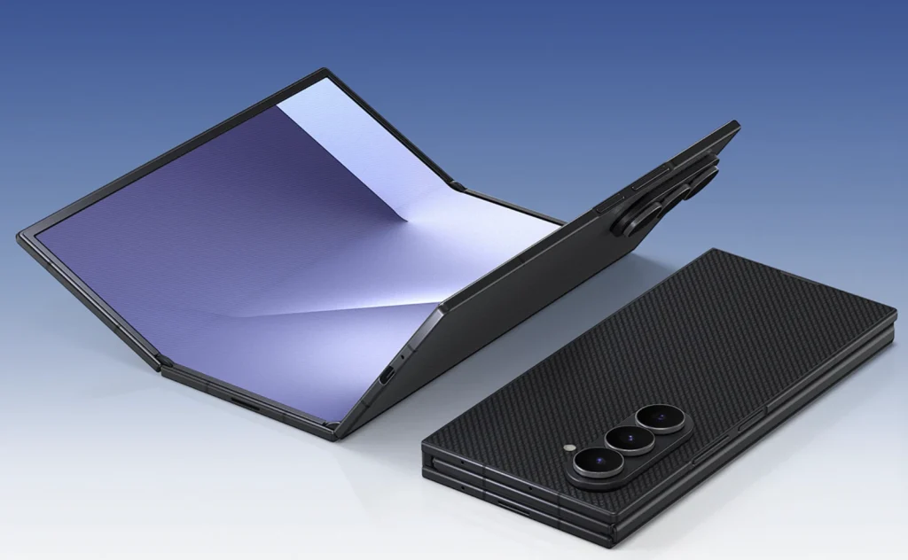 Tył to ceramic-glass fiber reinforced polymer, czyli kompozyt wzmacniany włóknem szklanym, który ma lepiej znosić mikropęknięcia niż klasyczne szkło. Zawiasy są dwa, różnej wielkości, oba z podwójną szyną w tytanowej obudowie. Samsung dobrze wie, że tutaj walczy nie tylko o wrażenie „wow”, ale też o koszty serwisu.